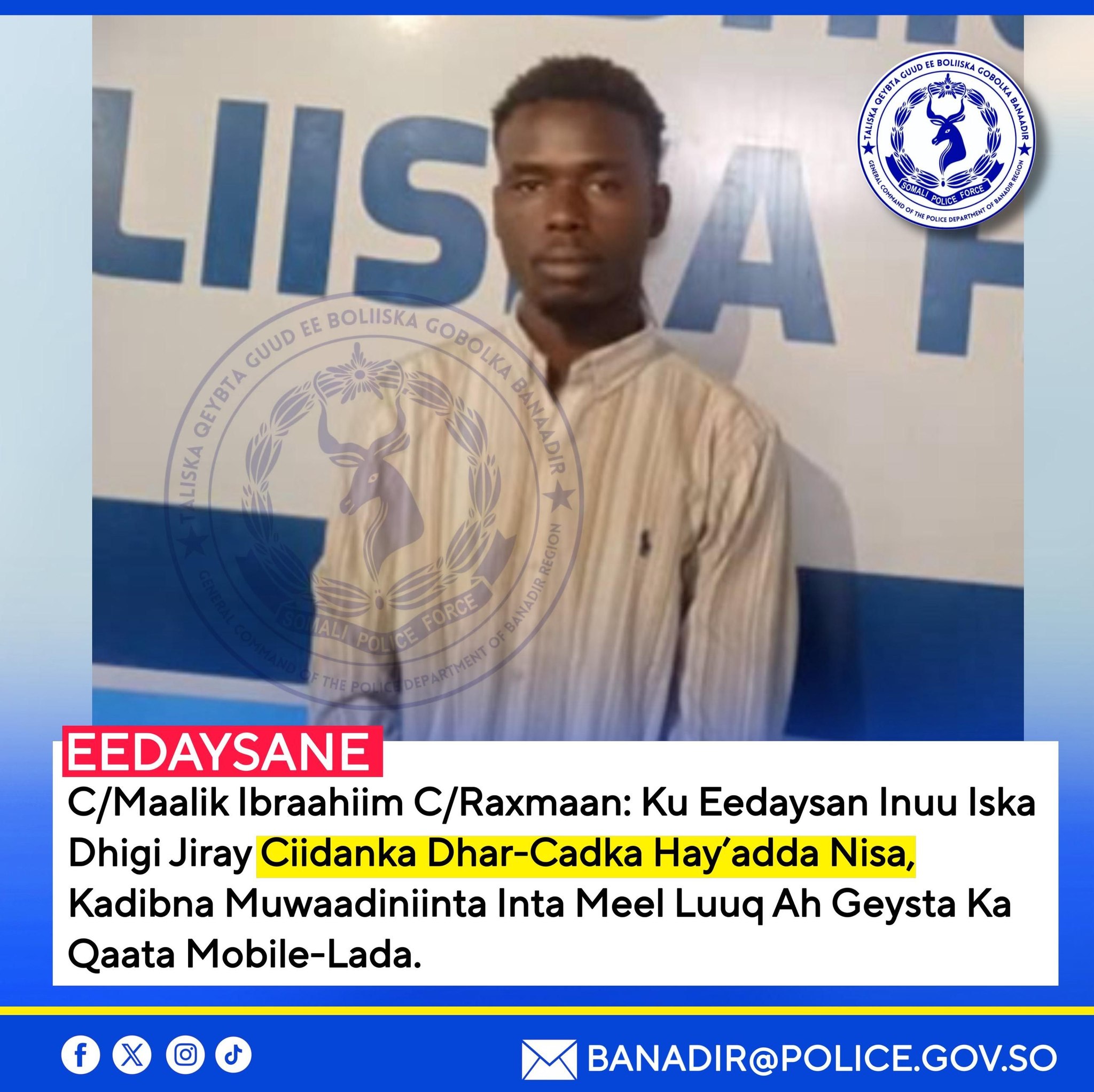 Muqdisho, Soomaaliya – Ciidanka Booliska Soomaaliyeed, gaar ahaan Saldhigga Booliska Degmada Hodan, ayaa gacanta ku dhigay eedaysane lagu magacaabo Cabdimaalik Ibraahim Cabdiraxmaan, kaas oo lagu soo qabtay tuhun ah inuu dadka ku khiyaameyn jiray isaga oo isu soo bandhigayay inuu yahay sarkaal ka tirsan Hay’adda Nabad Sugidda iyo Sirdoonka Qaranka (NISA).