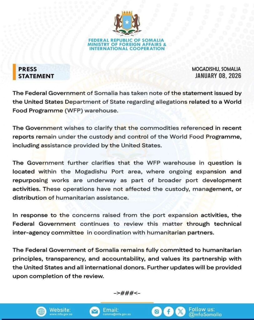 Muqdisho – Dowladda Federaalka Soomaaliya ayaa ka hadashay war-saxaafadeed ay soo saartay Wasaaradda Arrimaha Dibadda ee Mareykanka, kaas oo la xiriiray eedeymo ku saabsan bakhaar ay leedahay Hay’adda Cunnada Adduunka (WFP).