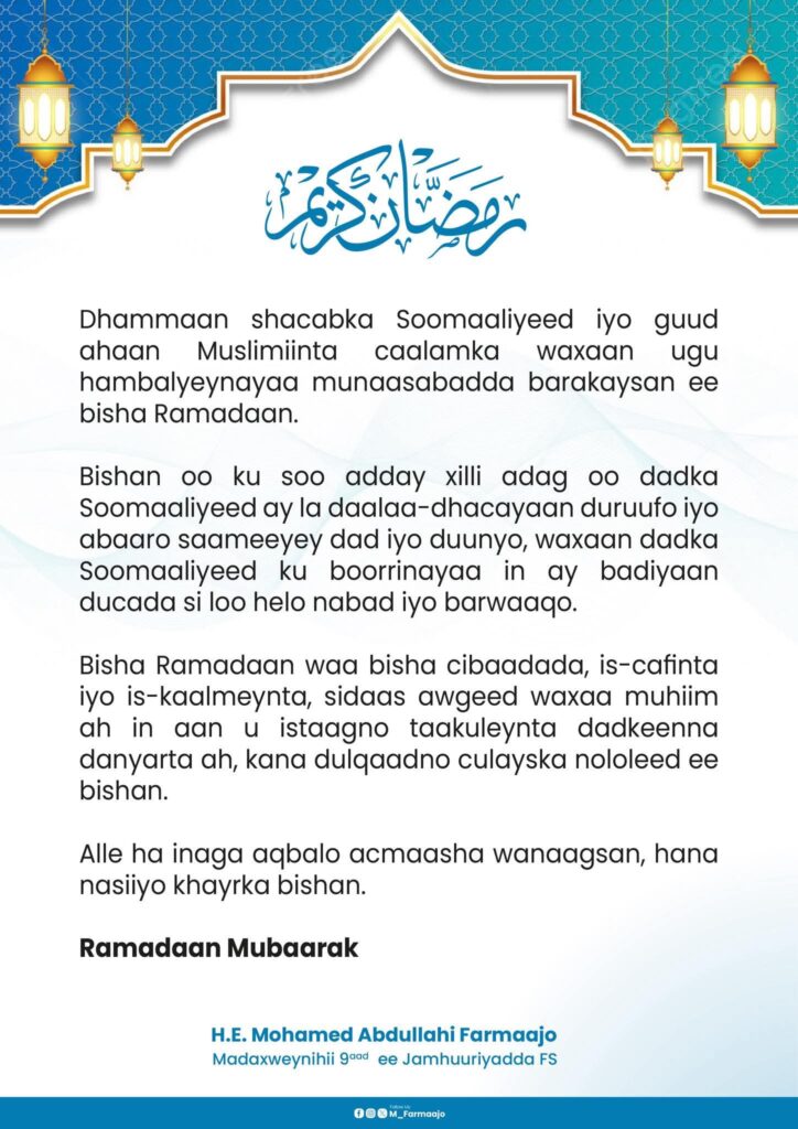 MUQSHO – Madaxweynihii hore ee Jamhuuriyadda Federaalka Soomaaliya, Maxamed Cabdullaahi Farmaajo, ayaa hambalyo u diray dhammaan shacabka Soomaaliyeed iyo guud ahaan Muslimiinta caalamka munaasabadda barakaysan ee bisha Ramadaan.