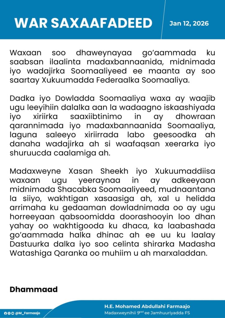 Dhanka kale, Farmaajo ayaa baaq u diray Madaxweynaha Jamhuuriyadda Federaalka Soomaaliya, Mudane Xasan Sheekh Maxamuud, iyo Xukuumaddiisa, isagoo ku boorriyay in la xoojiyo midnimada shacabka Soomaaliyeed, gaar ahaan xilligan siyaasadeed ee xasaasiga ah.