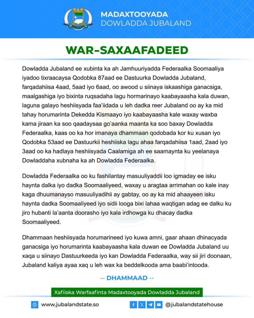 Dhankeeda, Jubaland ayaa caddeysay in heshiisyada la xiriira horumarinta Dekedda iyo Garoonka Diyaaradaha ee Kismaayo ay yihiin kuwo sharci ah oo waafaqsan Dastuurka Dowlad-Goboleedka Jubaland, iyadoo ku eedeysay Dowladda Federaalka mas’uuliyad-darro iyo ku takri-fal awoodeed.
