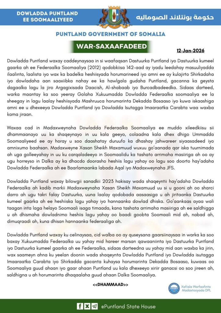 Puntland ayaa warsaxaafadeedkeeda ku sheegtay in go’aanka Golaha Wasiirradu uu jebinayo Dastuurka Kumeelgaarka ah, gaar ahaan qodobbada qeexaya awoodaha iyo madaxbannaanida dowlad-goboleedyada. Waxay sidoo kale xustay in heshiisyada lala galay Imaaraadka Carabta ay door muhiim ah ka qaadanayeen la dagaallanka argagixisada, sugidda amniga, iyo horumarinta kaabeyaasha dhaqaalaha ee deegaannadeeda.
