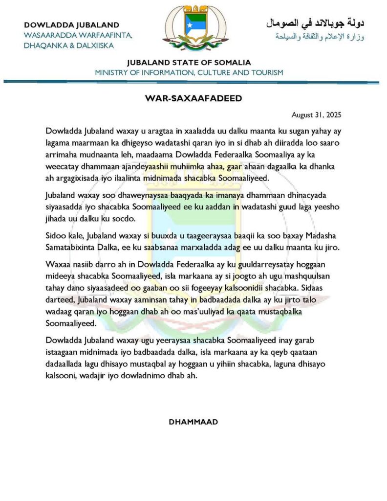 KISMAAYO, Soomaaliya – Maamulka Jubbaland ayaa dabciyay mowqifkiisa siyaasadeed, iyadoo uu soo saarey war saxaafadeed ay ka muuqatay inuu doonayo wadahadal qaran.