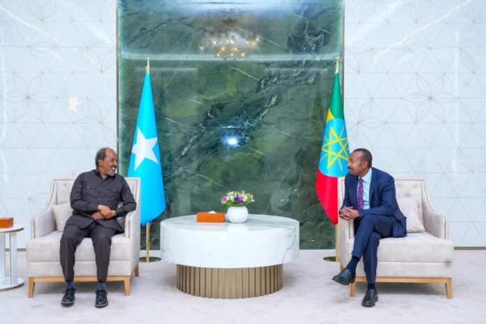 Addis Ababa – Ra’iisul Wasaaraha Itoobiya Abiy Ahmed ayaa shalay magaalada Addis Ababa kulan gaar ah kula yeeshay Madaxweynaha Soomaaliya Xasan Sheekh Maxamuud, iyadoo lagu sheegay inay ka wada hadleen “arrimo laba geesood ah iyo kuwo gobolka ah oo ay dan guud ka leeyihiin,” sida lagu sheegay war kooban oo ka soo baxay xafiiska Ra’iisul Wasaaraha Itoobiya.