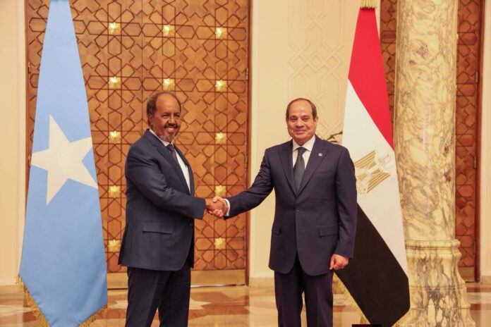 Qaahira – Madaxweynaha Jamhuuriyadda Federaalka Soomaaliya, Mudane Xasan Sheekh Maxamuud, ayaa si heer sare ah loogu soo dhaweeyay Qasriga Madaxtooyada Al-Itixaadiya ee magaalada Qaahira, caasimadda Jamhuuriyadda Carabeed ee Masar, halkaas oo uu kula kulmay dhiggiisa, Mudane Cabdifataax Al-Sisi.