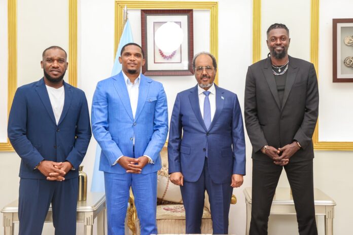 Muqdisho, May 28, 2025; Madaxweynaha Soomaaliya Mudane Xasan Sheekh Maxamuud ayaa Madaxtooyada ku qaabilay ciyaartoydii hore ee caanka ka ahaa dhanka kubadda cagta caalamka, Samuel Eto’o oo ah Gudoomiyaha Xiriirka Kubadda Cagta Cameroon, Emmanuel Adebayor, iyo Jay-Jay Okocha oo booqasho taariikhi ah ku timid dalka.