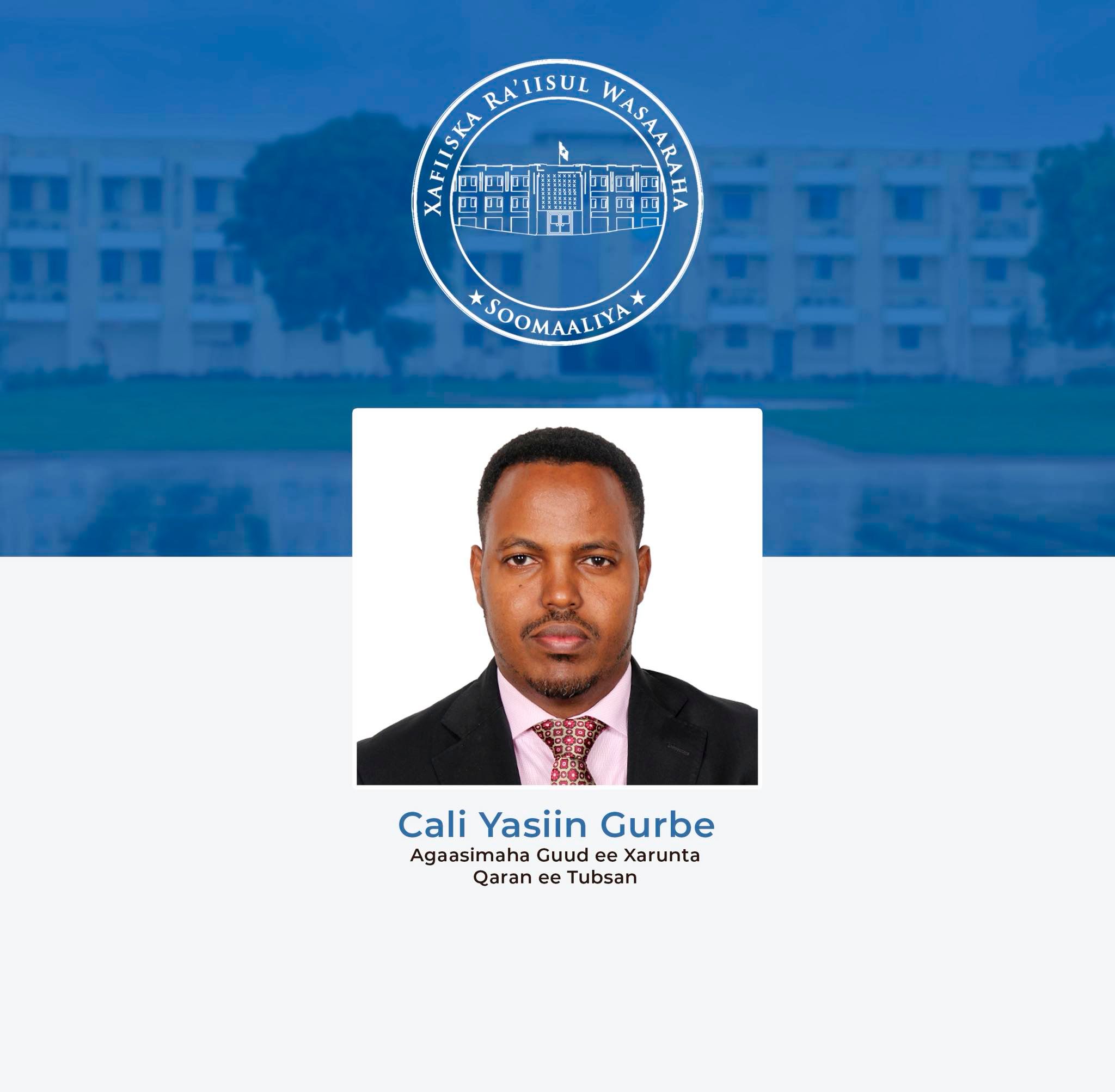 MUQDISHO, Soomaaliya – Ra’iisul Wasaaraha Xukuumadda Federaalka Soomaaliya, Mudane Xamsa Cabdi Barre, ayaa maanta u magacaabay Mudane Cali Yaasiin Gurbe inuu noqdo Agaasimaha Guud ee Xarunta Qaran ee Ka-hor-tagga iyo La-dagaallanka Fikirrada Xagjirka ah ee Rabshadaha Wata (TUBSAN).