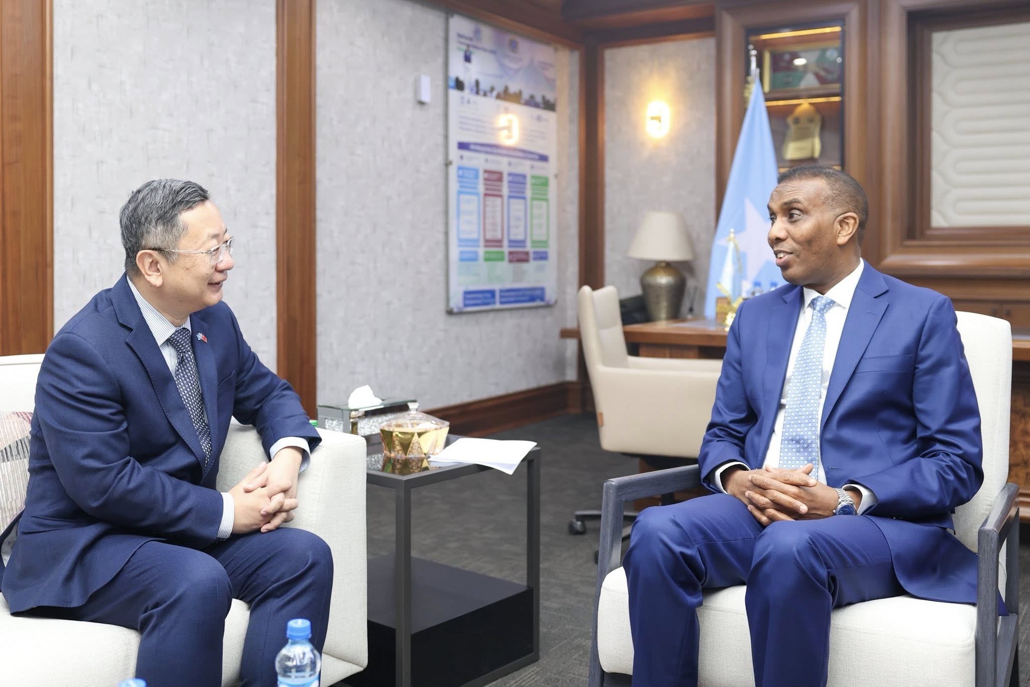 Muqdisho, Soomaaliya – Ra’iisul Wasaaraha Soomaaliya, Mudane Xamsa Cabdi Barre, ayaa maanta xafiiskiisa ku qaabilay Danjiraha Dowladda Shiinaha u fadhiya Soomaaliya, Mudane Wang Yu, iyagoo ka wada hadlay xoojinta xiriirka diblomaasiyadeed iyo iskaashiga laba geesoodka ah ee ka dhexeeya Soomaaliya iyo Shiinaha.