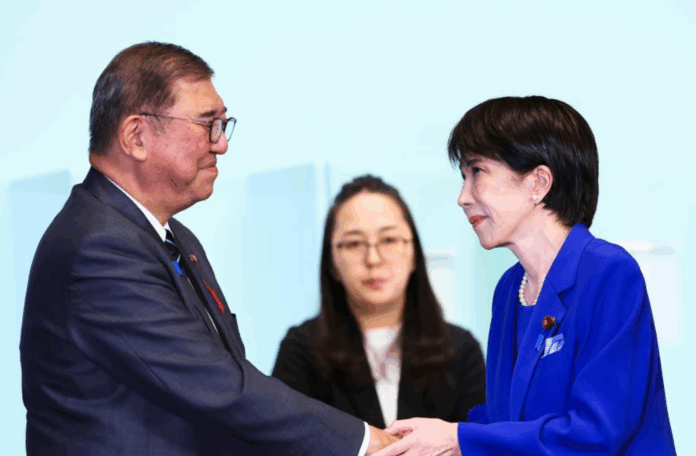 Sanae Takaichi (R) shakes hands with Japanese Prime Minister Shigeru Ishiba, also former president of Japan’s ruling Liberal Democratic Party (LDP), after winning LDP presidential election at the LDP headquarters in Tokyo, Japan, Oct. 4, 2025. Japan’s former Economic Security Minister Sanae Takaichi won Japan’s LDP presidential election on Saturday, making her likely to become Japan’s first female prime minister. (Kim Kyung-Hoon/REUTERS/Pool via Xinhua)