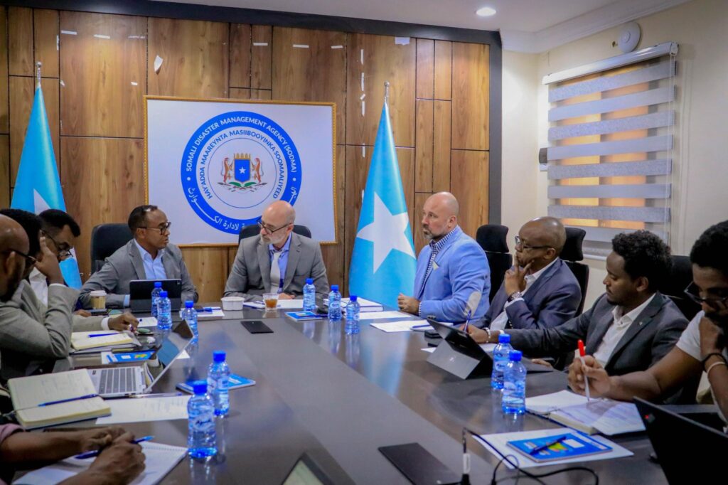 Muqdisho – Guddoomiyaha Hay’adda Maaraynta Musiibooyinka Soomaaliyeed (SoDMA), Mudane Maxamuud Macallin Cabdulle, iyo Ku Xigeenka Ergayga Gaarka ah ee Xoghayaha Guud ee Qaramada Midoobay u qaabilsan Soomaaliya, ahna Xiriiriyaha Arrimaha Bani’aadamnimada, ayaa si wadajir ah u shir guddoomiyay kulan ay isugu yimaadeen madaxda hay’adaha SoDMA iyo OCHA.