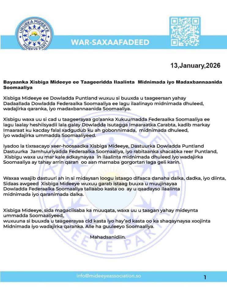 Garoowe, Soomaaliya – Ururrada siyaasadda ee ka jira deegaanada Dowlad-goboleedka Soomaaliyeed ee Puntland ayaa soo saaray bayaanno ay ku muujinayaan taageeradooda doorka Dowladda Federaalka Soomaaliya (DFS) ee difaaca midnimada, wadajirka dhulka iyo madax-bannaanida Jamhuuriyadda Federaalka Soomaaliya.
