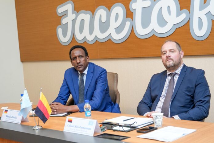 MUQDISHO– Wafdi heer sare ah oo ka socday Dowladda Jamhuuriyadda Federaalka Jarmalka, oo uu hoggaaminayay Madaxa Xiriirka Dowladaha ee Federaalka Booliiska Jarmalka, Mudane Colonel Niels Zimmermann, ayaa booqasho shaqo ku yimid Jamhuuriyadda Federaalka Soomaaliya. Wafdiga ayaa kulan miro-dhal ah la yeeshay Madaxda Hay’adda Socdaalka iyo Jinsiyadda (HSJ), oo uu hoggaaminayay Agaasimaha Guud ee hay’adda, Mudane Mustafa Dhuxulow.