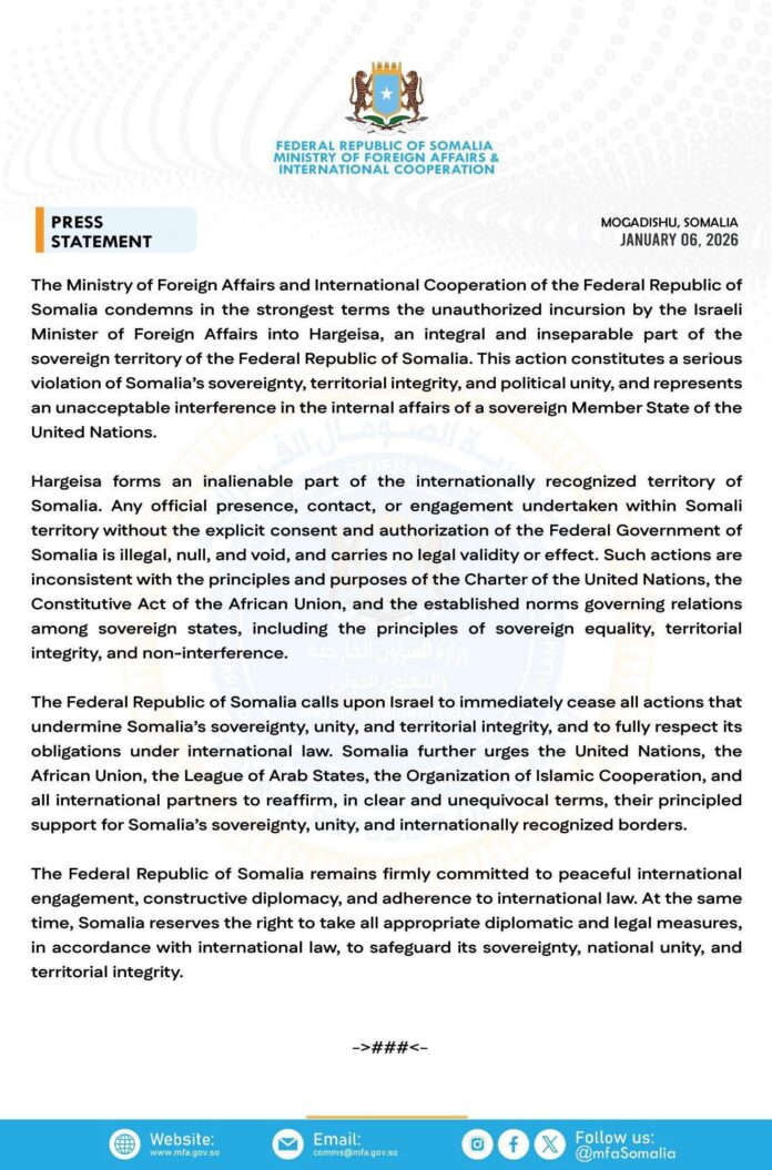 Muqdisho – Wasaaradda Arrimaha Dibadda iyo Iskaashiga Caalamiga ah ee Jamhuuriyadda Federaalka Soomaaliya waxay si adag u cambaareyneysaa duullaankii qaawanaa ee Wasiirka Arrimaha Dibadda Israa’!!l uu ku soo qaaday Hargeysa, oo ah qayb muhiim ah oo aan la kala saari karin oo ka mid ah dhulka madaxa-bannaan ee Jamhuuriyadda Federaalka Soomaaliya.