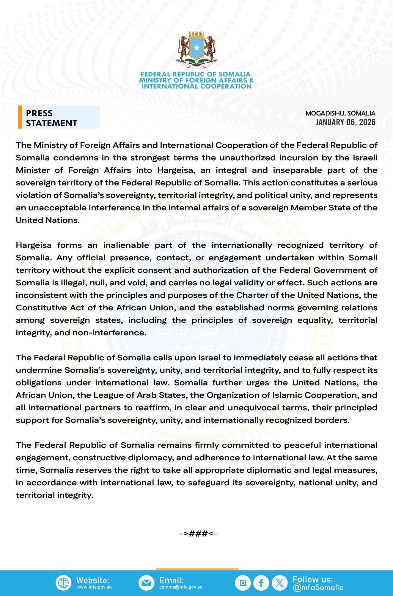 Jamhuuriyadda Federaalka Soomaaliya waxay ugu baaqaysaa Israa’iil inay si degdeg ah u joojiso dhammaan falalka wax u dhimaya madaxbannaanida, midnimada, iyo sharafta dhuleed ee Soomaaliya, iyo inay si buuxda u ixtiraamto waajibaadka saaran sharciga caalamiga ah.