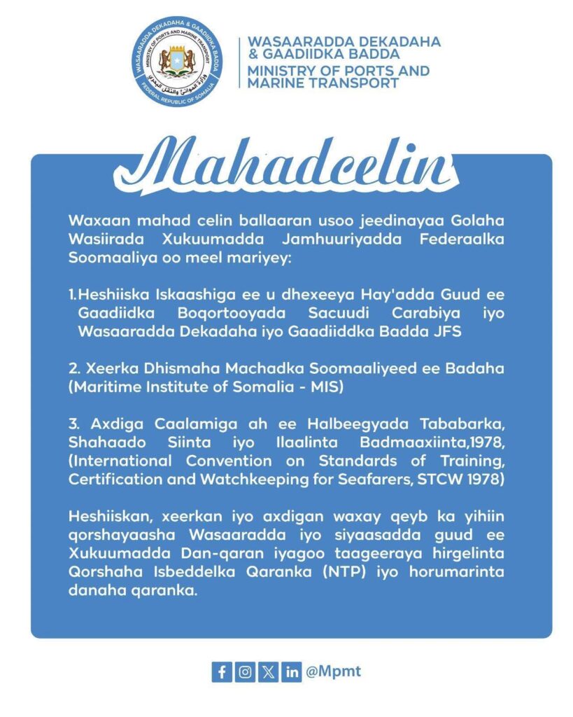 MUQDISHO – Wasiirka Wasaaradda Dekaddaha iyo Gaadiidka Badda XFS Mudane Cabdulqaadir Maxamed Nuur ayaa uga Mahadceliyay Golaha Wasiirada Xukuumadda Federaalka Soomaaliya oo meel mariyey: