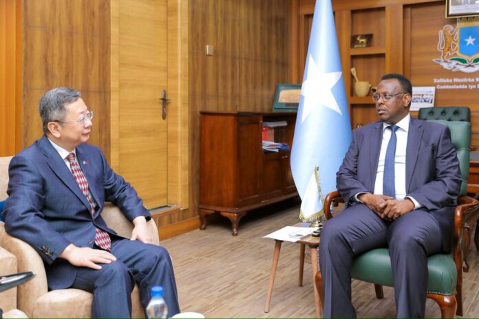 Muqdisho, Soomaaliya — Wasiirka Wasaaradda Cadaaladda iyo Arrimaha Dastuurka Xukuumadda Jamhuuriyadda Federaalka Soomaaliya, Mudane Xasan Macalin Maxamuud, ayaa xarunta wasaaradda ku qaabilay Safiirka Dowladda Shiinaha ee Soomaaliya, Mudane Wang Yu.