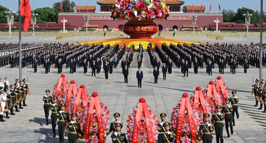 BEIJING, Sept. 30 (Xinhua) — Chinese President Xi Jinping and other leaders of the Communist Party of China (CPC) and the state attended a ceremony on Tuesday morning at Tian’anmen Square in central Beijing to present flower baskets to fallen national heroes.